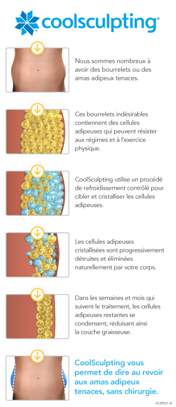 La Cryolipolyse est un procédé récent, certifié, non invasif, dont le principe permet la réduction progressive des cellules graisseuses par un froid extrême, contrôlé en continu, sans altérer la peau, grâce à un appareil appelé CoolSculpting ® by Zeltiq.
